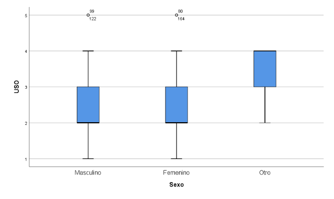 Al ser una significancia entre grupos mayor al 0,05 no existen diferencias significativas, (si se toma el género como una variable dicotómica) lo que cumpliría nuestra tercera hipótesis (1.3). Sin embargo tal como se observa en el gráfico de cajas y bigotes, aquellas personas que se identifican con un género no binario presentan diferencias estadísticamente significativas con un mayor uso de la IA en el contexto educativo.