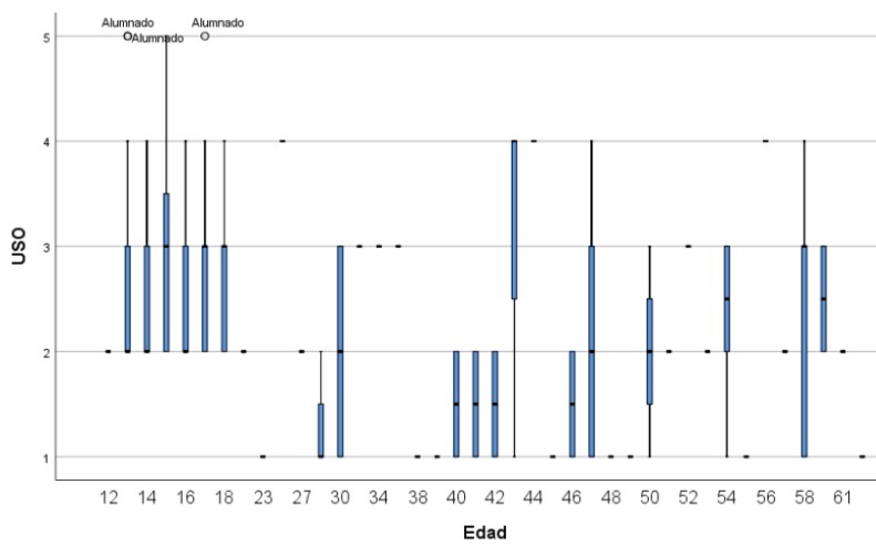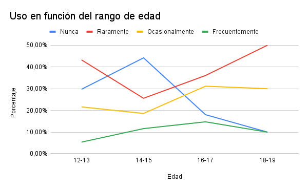 En función a la variable edad, el uso «frecuentemente» es más común en el grupo de 16 a 17 años de edad con un reporte del 14,75%, tal y como se observa en la figura. La tendencia más común es usarla raramente, con el mayor número de reportes en cada grupo (un 43,24% frente al 29,73% de nunca, el 21,62% de ocasionalmente y el 5,41% de frecuentemente en el grupo de 12-13 años por ejemplo), excepto en el de 14 a 15 años, que es el grupo que menos reporta usarlo con la variable «nunca» en un 44,19%. Se observa como la variable nunca toma los menores valores en los dos grupos de mayor edad.