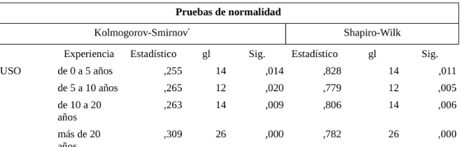 Pruebas de normalidad de la variable uso de la IA en relación con la experiencia docente.