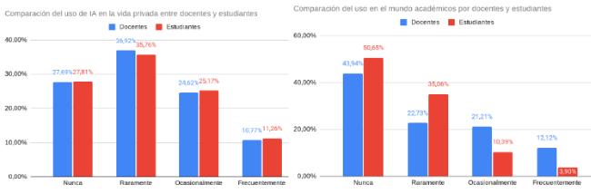 Gráficas comparativas entre la frecuencia de uso de profesores y estudiantes en el ámbito personal y académico