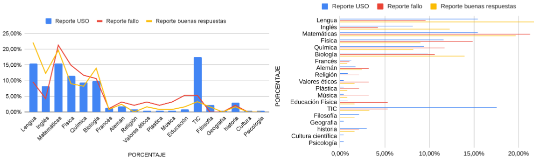 La asignatura en la que más uso se reporta es TIC, seguida de lengua y matemáticas. La asignatura en la que más fallos se reporta es matemáticas, seguida de física y biología. La asignatura en la que mejores respuestas se reporta es lengua, seguida de matemáticas e inglés. Por lo general el valor del uso de una asignatura es cercano al de su reporte de fallo y mejores respuestas. Aunque en casos como el de TIC se reportan mucho uso y poco fallo o mejores respuestas, siendo el primer caso algo más común. Esto corrobora nuestra hipótesis 5.