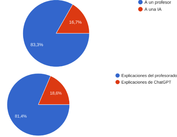 Gráficas sobre la preferencia a preguntar a un profesor o a una IA y la explicación de un profesor o de ChatGPT.