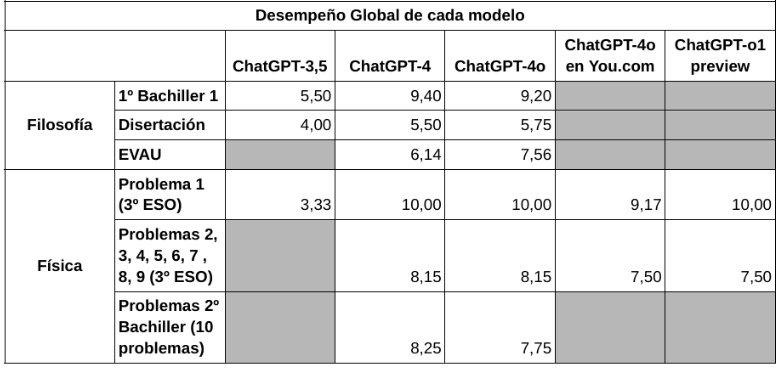 El modelo más reciente, ChatGPT-4o, es el que obtiene mejores resultados en casi todas las pruebas. Su desempeño global es el mejor exceptuando el primer examen de primero de Bachiller.